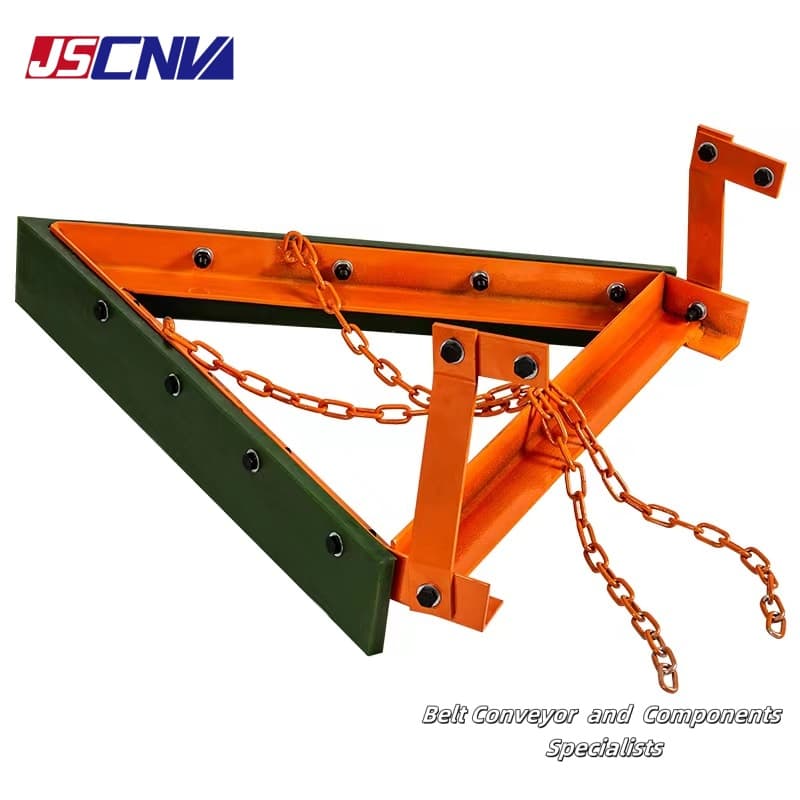 V-plog remrenser er en type returbeltrenser. Den brukes hovedsakelig foran transportbåndets bøyeskive på båndtransportøren og foran den tunge vertikale strammeanordningen. Den har egenskapene til syre- og alkalimotstand, flammehemmende og antistatisk, høy slitestyrke og skader ikke beltet. Bladet er laget av høystyrke polyuretan, den V-formede designen sikrer beltets renhet, og den automatiske gravitasjonsdesignen sikrer automatisk kompensasjon når bladet slites ut.